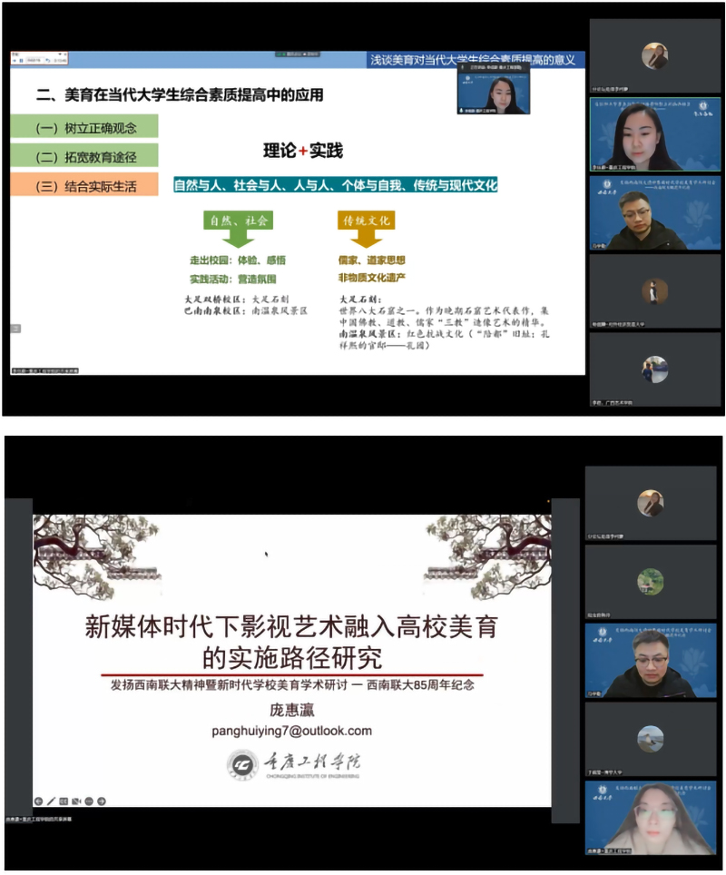 本网讯 (文/图 数字艺术学院 李佳蔚)12月17日,在西南联大建校85周年之际,为了弘扬“西南联大精神”、推动新时代学校美育工作,研讨会组办方联合全国有关高校和机构共同召开“纪念西南联大建校 85 周年暨新时代学校美育研讨会”,并邀请全国知名专家主题演讲和分论坛演讲。学校美育课程组教师代表李佳蔚、庞惠瀛和袁容三位老师,参加了“纪念西南联大建校85周年暨新时代学校美育研讨会”并作相关主题发言。