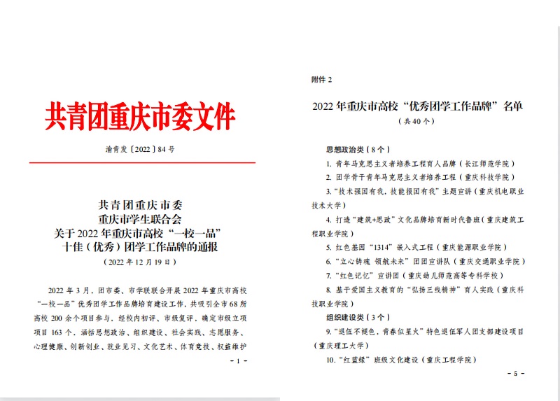 本网讯(文/图 校团委 黄涛)近日,共青团重庆市委、重庆市学生联合会发布了《关于2022年重庆市高校“一校一品”十佳(优秀)团学工作品牌的通报》,我校“红蓝绿”班级文化建设荣获2022年重庆市高校“一校一品”优秀团学工作品牌。