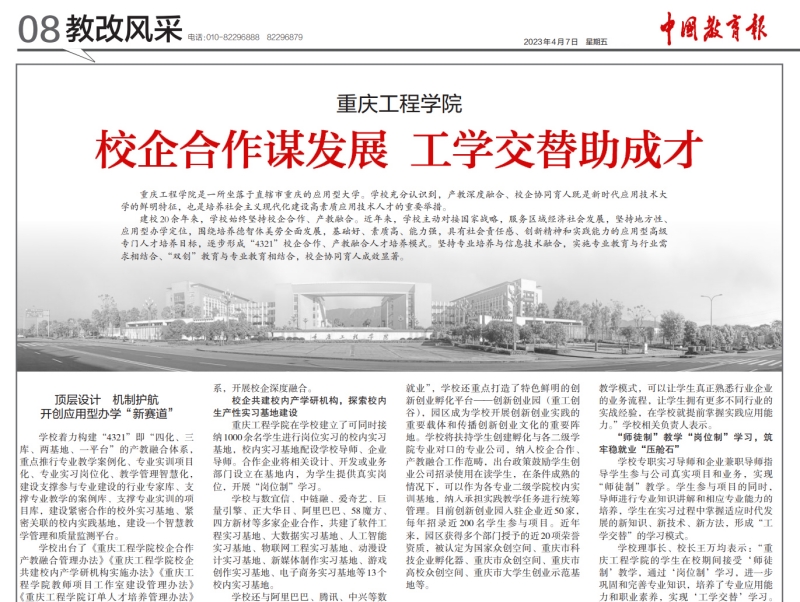 本网讯(文/图 党委宣传部)4月7日,《中国教育报》刊发了党委副书记、常务副校长张业平署名文章《校企合作谋发展 工学交替助成才》,大篇幅报道我校应用型人才培养工作。