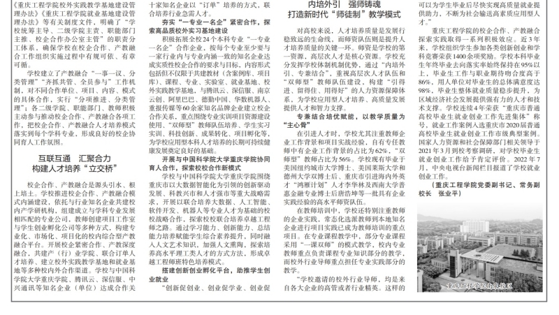 学校理事长、校长王万均表示:“重庆工程学院的学生在校期间接受‘师徒制’教学,通过‘岗位制’学习,进一步巩固和完善专业知识,培养了专业应用能力和职业素养,实现‘工学交替’学习。可以为学生毕业后尽快实现高质量就业提供助力,不断为社会输送高素质应用型人才。”