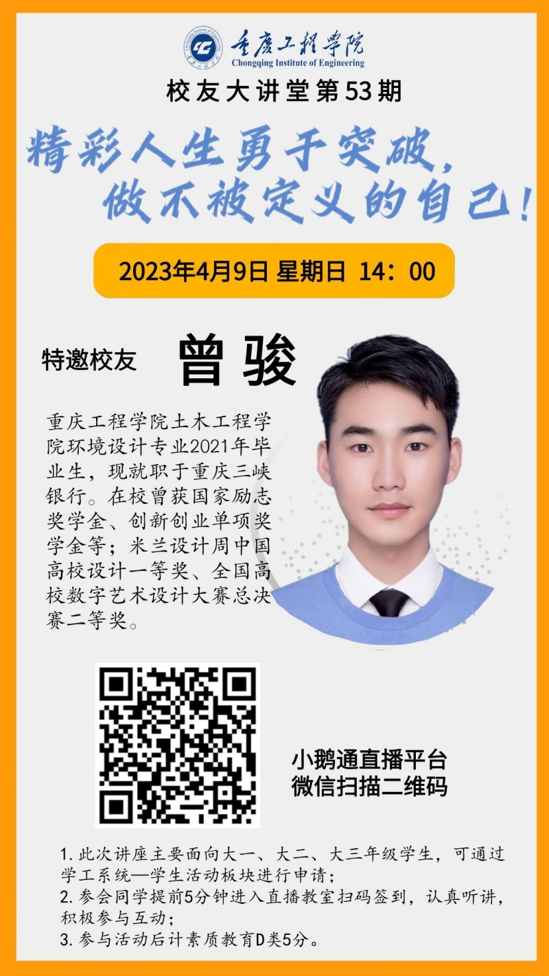 本网讯(文/图 就业指导中心 叶秋清)为进一步增进校友与母校的交流,发挥优秀校友的榜样和激励作用,开拓在校大学生的职业视野,学校就业指导中心于4月9日下午在小鹅通直播平台举办“精彩人生勇于突破,做不被定义的自己”线上交流活动,由建筑工程学院环境设计专业2021届优秀毕业生曾骏学长主讲,3000多名同学参加了此次活动。