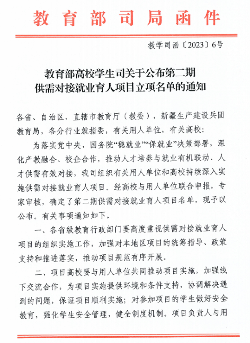 本网讯(文/图 招就处 叶秋清)近日,教育部发布了《关于公布第二期供需对接就业育人项目立项名单的通知》(教学司函【2023】6号),经前期高校与用人单位联合申报,专家审核,确定了第二期供需对接就业育人项目名单,我校共7个项目获批立项。