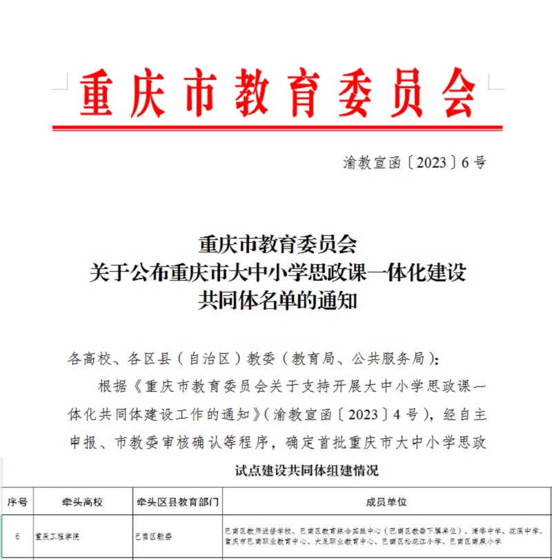 我校党委宣传部牵头,马克思主义学院、学生处和软件与人工智能学院共同积极参与,认真准备材料申报。经市教委审核确认等程序,确定我校为首批重庆市大中小学思政课一体化试点建设共同体牵头高校。该共同体为1所高校和区县教育部门为牵头单位,10家左右大中小学和教育研究机构为成员单位的思政课一体化建设创新性研究型工作平台,每两年为一个建设周期。