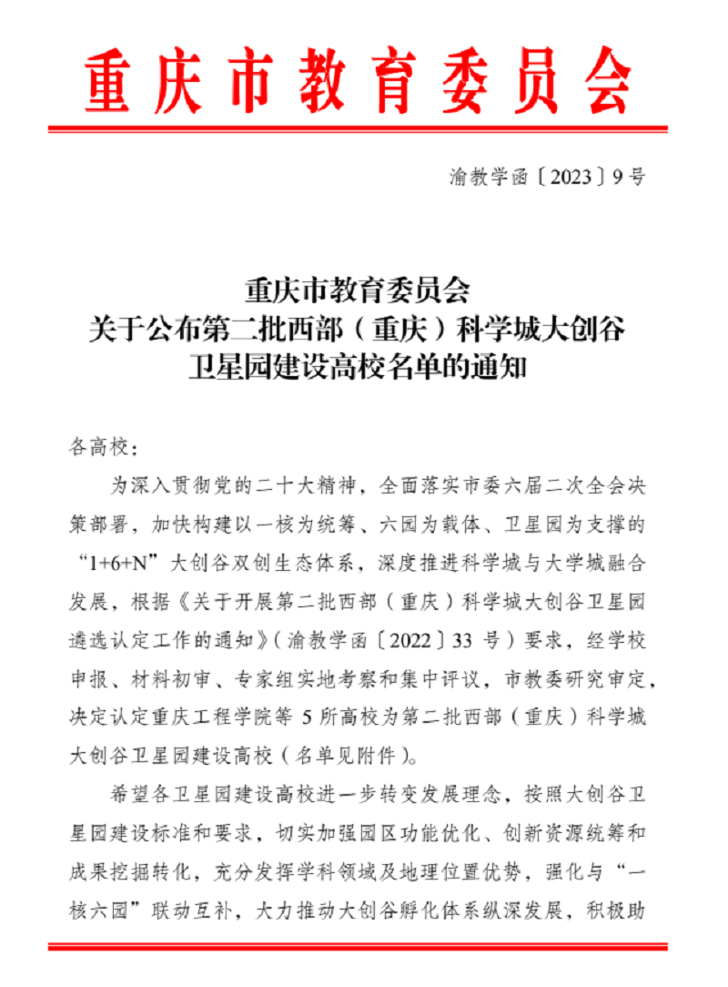 本网讯(文/图 创新创业园 吴乐乐)近日,重庆市教育委员会印发了《关于公布第二批西部(重庆)科学城大创谷卫星园建设高校名单的通知》,我校创新创业园被认定为西部(重庆)科学城大创谷卫星园。