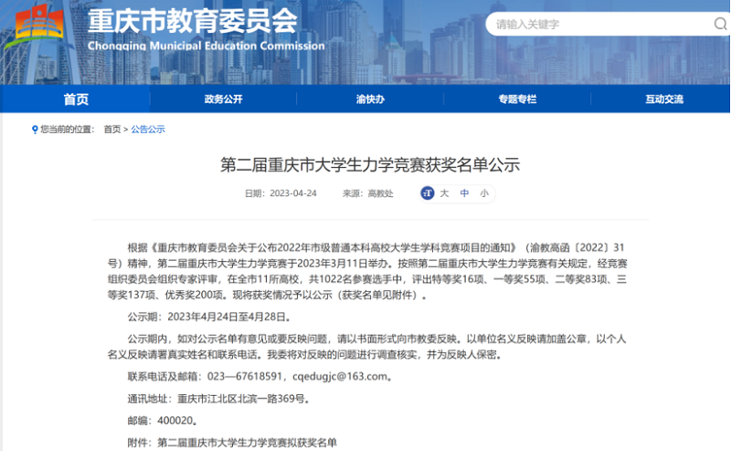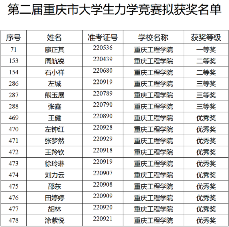 本网讯(文/图 通识学院 陈阳)4月24日,从重庆市教育委员会获悉,我校学子在第二届重庆市大学生力学竞赛中喜获一等奖1项、二等奖2项、三等奖3项、优秀奖10项。