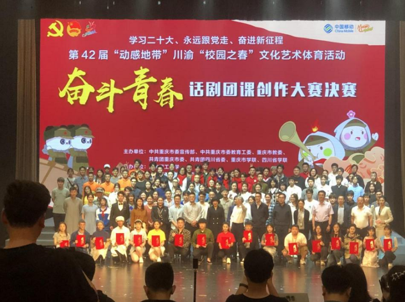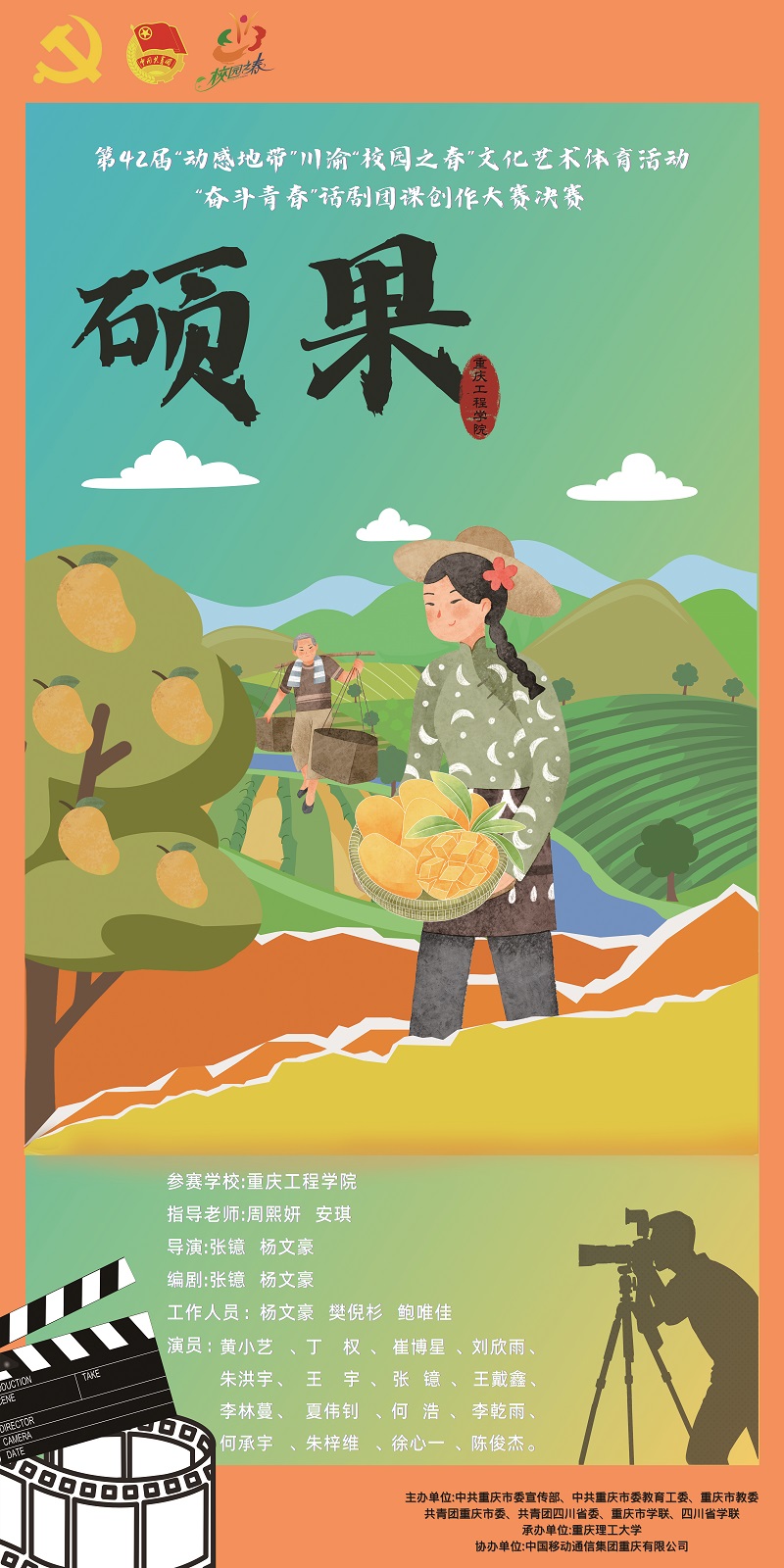 4月28日,第42届川渝“校园之春”文化艺术体育活动“奋斗青春”话剧团课创作大赛决赛在重庆理工大学影剧场大厅举行,我校大学生艺术团话剧团凭借话剧《硕果》在全市各大高校200部作品中脱颖而出,斩获全市三等奖。话剧以一群大学生为主角,讲述了他们在助力乡村电商、直播助农中成长与奋斗的故事,充分展现了当代大学生的精神风貌。党的二十大报告指出,发展乡村特色产业,拓宽农民增收致富渠道。剧里,这一群年轻人响应号召扎根乡振兴路;剧外,学校主动对接国家战略、主动融入地方经济发展形成校村共建长效机制,围绕培养应用型高级专门人才培养目标,为学子提供真实岗位……这一系列举措,催生了《硕果》。今天,让我们走进主创团队,一起探索这背后的故事。