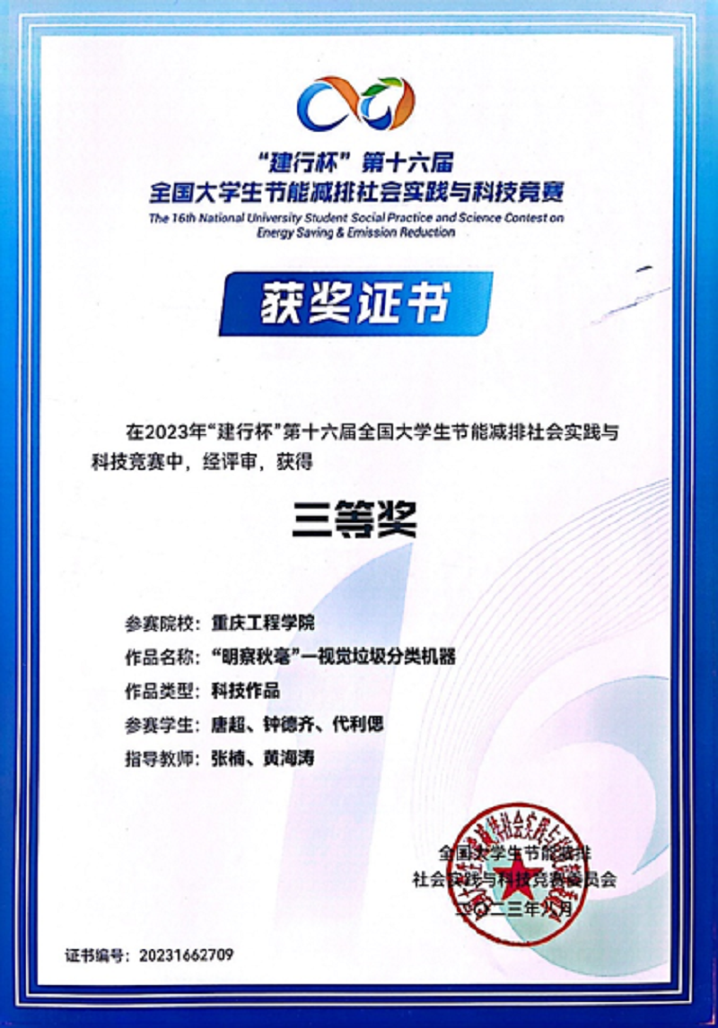 本网讯(文/图 通识学院 刘燕月)近日,由东南大学承办的“建行杯”第十六届全国大学生节能减排社会实践与科技竞赛成绩揭晓,我校由唐超、钟德齐、代利偲3名同学组成的团队,在通识学院张楠和黄海涛老师的指导下,经过不懈努力,最终在全国638所院校6852个团队作品中,喜获国家级三等奖。