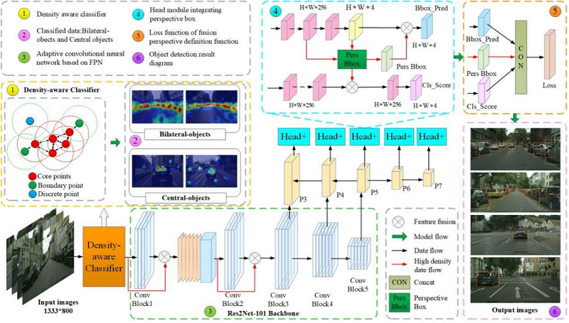 针对复杂交通环境中对象相互遮挡和置信度不准确的问题,提出了一种基于密度感知的带透视盒的自适应网络对象检测算法。算法设计了密度感知分类器用于估计图像中对象的密度,通过在高密度网络的检测头上增加透视框,基于透视原理预测被遮挡物体位置,并集成透视损失函数,如图1所示。
