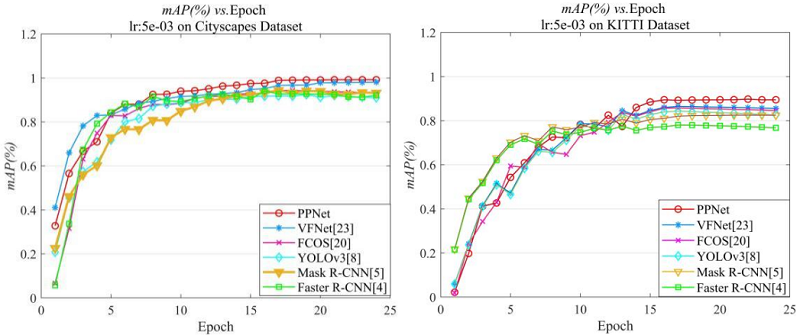 通过对数据集进行手动标记训练和测试,实验表明,在不降低检测速度的情况下,在KITTI数据集上,PerspectiveNet的mAP比VarifocalNet高3.6%,在Cityscapes数据集上比VarifacalNet高1.7%,如图2所示。
