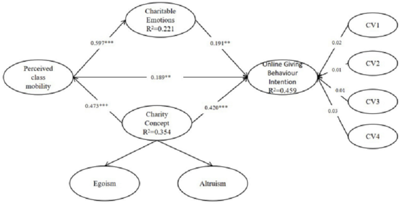 论文基于实证研究,从互联网慈善的新背景出发,以感知阶层流动性、慈善情感、网络捐赠行为等变量作为核心变量,探讨了感知阶层流动性、慈善情感、慈善认知和网络捐赠行为的作用,解析了消费者感知阶层流动性与慈善情感和慈善认知的关系,分析了各变量对消费者网络捐赠行为的影响。研究采用偏最小二乘法对假设进行数据分析。结果表明,感知阶层流动性对在线捐赠行为意向有显著影响。