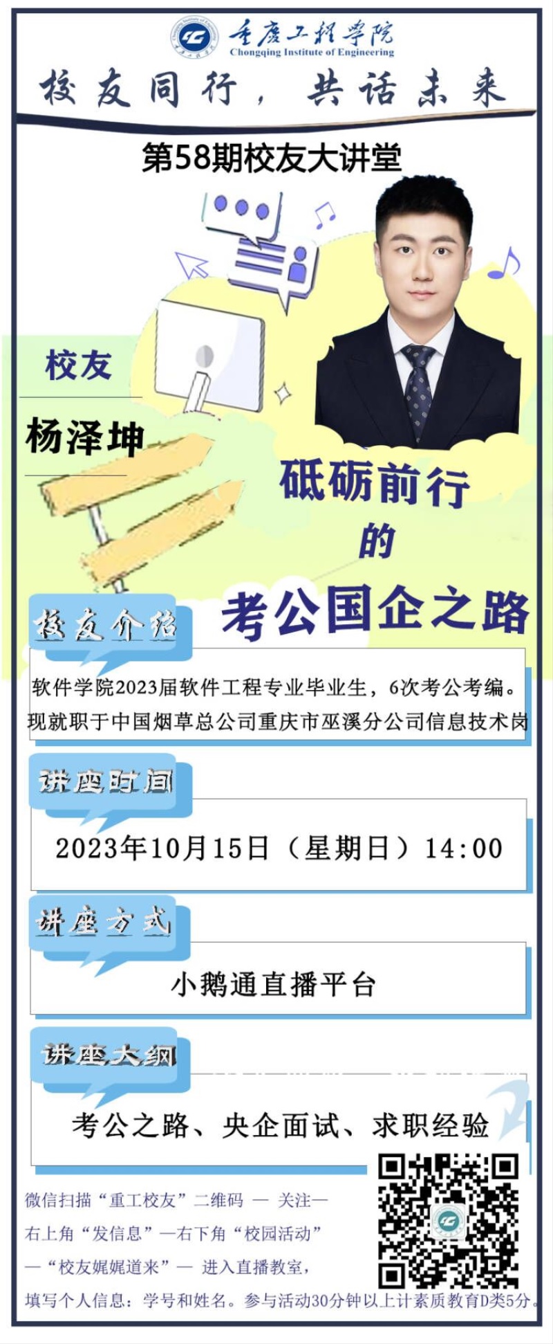 本网讯(文/图 就业指导中心 叶秋清)为进一步增进校友与母校的交流,发挥优秀校友的榜样和激励作用,开拓在校大学生的职业视野,10月15日下午,就业指导中心举办了第58期“校友大讲堂”线上交流活动,邀请了我校2023届软件学院毕业生杨泽坤学长为重工学子做“砥砺前行的考公央企之路”主题分享,全校3000多名同学通过鹅直播参与了此次活动。
