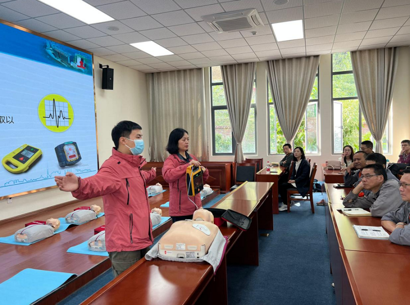 培训以理论教学及实践操作相结合的方式展开。市急救中心护师罗昌慧详细讲解了心肺复苏急救技能的基础知识及步骤,就评估现场环境安全、判断病人意识和呼吸、正确摆放体位、胸外按压操作要领及如何评估心肺是否复苏等进行了重点讲解,同时对急性气道异物梗阻解除、AED使用等意外伤害处理应急理论知识进行了说明。随后,授课助教还通过仿真模型现场演示了心肺复苏应急救护实际操作技能,示范了AED除颤仪的具体使用方法。讲解生动易懂,参加培训的教职工们认真聆听,并积极互动。实践环节,我校教职工们按照分组认真有序的进行心肺复苏技能操练,培训最后还对参训人员进行了理论和技能考核。