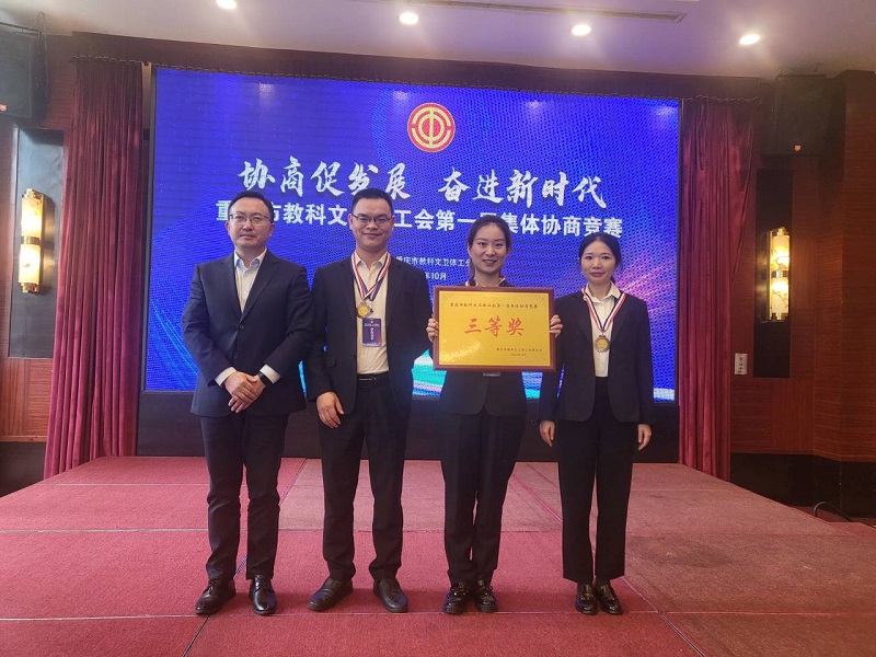 经校工会选拔,我校推荐了四名教职工代表参与此次竞赛活动。竞赛过程中,通过给出案例背景,针对协商议题分企业方和职工方协商代表进行现场模拟集体协商。我校参赛选手精心准备、严谨作答、协同作战,在9支参赛队中脱颖而出,取得了第三名的优异成绩,获得团体三等奖;我校何冠瑶老师,获得优秀协商员个人荣誉称号。
