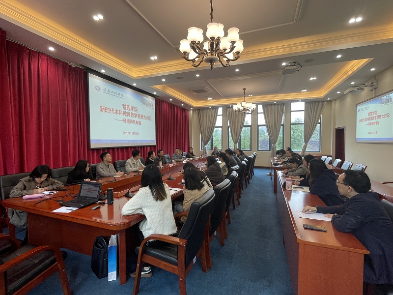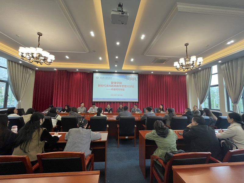 本网讯(文/图 管理学院 荣菁菁)为贯彻落实学校《关于开展2023年新时代教育教学思想观念大讨论的通知》文件要求,管理学院于11月10日在行政楼开展专题学习讨论,本次会议邀请到杨生元博士授课分享。副校长王琼花、校长助理兼管理学院院长简玉刚出席会议,管理学院全体院领导、教师代表参加会议。