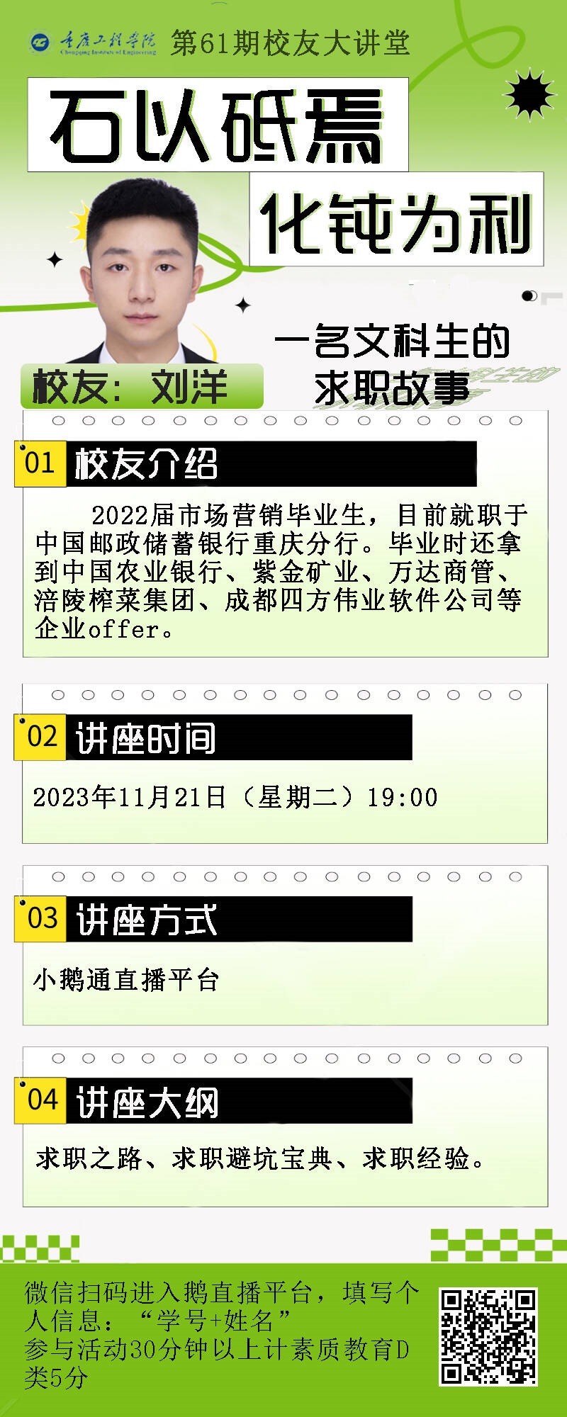 最后,刘洋鼓励学弟学妹们能够以积极的态度面对就业问题,先就业再择业,通过自身的努力,逐步实现生活的理想状态和自我价值的最大化。他的经验和建议对于正在求职或即将求职的同学们来说,无疑是一份宝贵的财富。