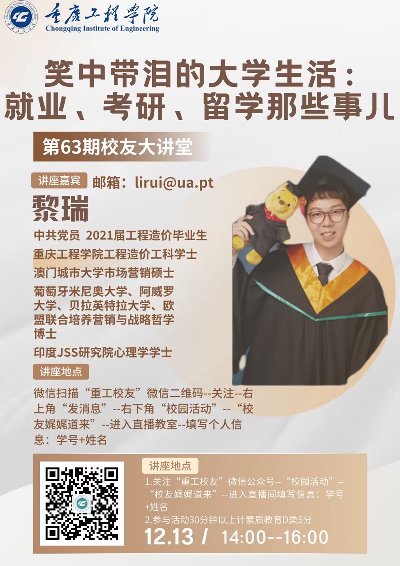 黎瑞,中共党员,土木工程学院2021届工程造价专业学生,澳门城市大学工商管理硕士研究生。在校期间,黎瑞学长多次获得国家级、市级、校级荣誉和奖项。曾参加2019重庆国际半程马拉松志愿者、重庆慧灵残障社会工作服务中心志愿者等公益活动。黎瑞学长的求学之路充满了艰辛与奋斗,从澳洲到葡萄牙,都是他努力追求自我理想实现的证明。