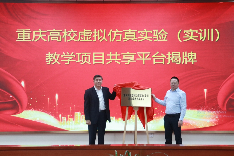 图/重庆昭信教育研究院专家,原重庆市教育信息技术与装备中心副主任李白燕与重庆工程学院副校长谭明术为重庆高校虚拟仿真实验(实训)教学项目共享平台揭牌