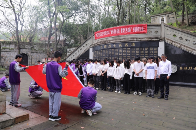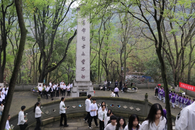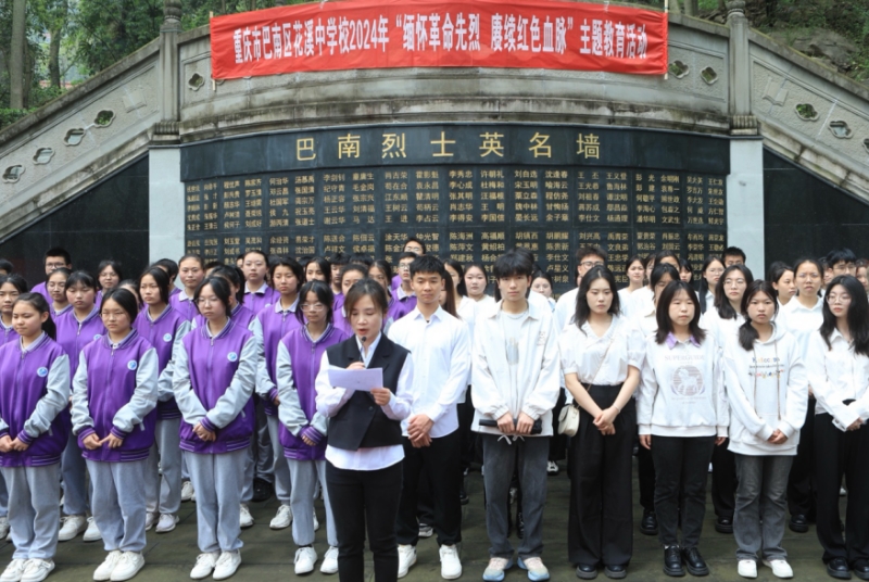在庄严肃穆的南泉革命烈士陵园,全体师生奏唱国歌、肃立默哀、瞻仰烈士纪念碑。花溪中学历史教师贺孝香为大家讲述了解放南泉的历史故事,“南泉战斗历时56小时,是解放重庆发生的一次持续时间最长,最激烈的战斗……”她勉励同学们不忘初心,牢记使命,以赤诚之心报家国情怀。随后,花溪中学学生讲解员带来一首诗朗诵,致敬先烈英勇伟绩,传承红岩精神。最后,大家依次来到革命烈士墓前,向烈士墓敬献鲜花和花圈,深切缅怀革命先烈的英雄事迹,追思他们的丰功伟绩。