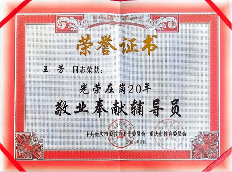 据悉,“光荣在岗20年敬业奉献辅导员”称号由重庆市教委在全国教育系统首创,旨在奖励一线从事专职辅导员工作20年以上的优秀辅导员,本次共有60名辅导员获评该称号。王芳老师于2004年入职我校担任辅导员工作,至今已有20个年头,共陪伴1700余名学生走过宝贵的青春岁月,曾多次获得“就业先进个人”“优秀党员”“优秀党务工作者”等荣誉称号。在工作中坚持“以身示范,严管厚爱”,探寻出“1+2+3+N”的班级管理模式,所带的班级被评为“重庆市2023学年度先进班集体”,多间寝室被评为“重庆市高校文明寝室”。