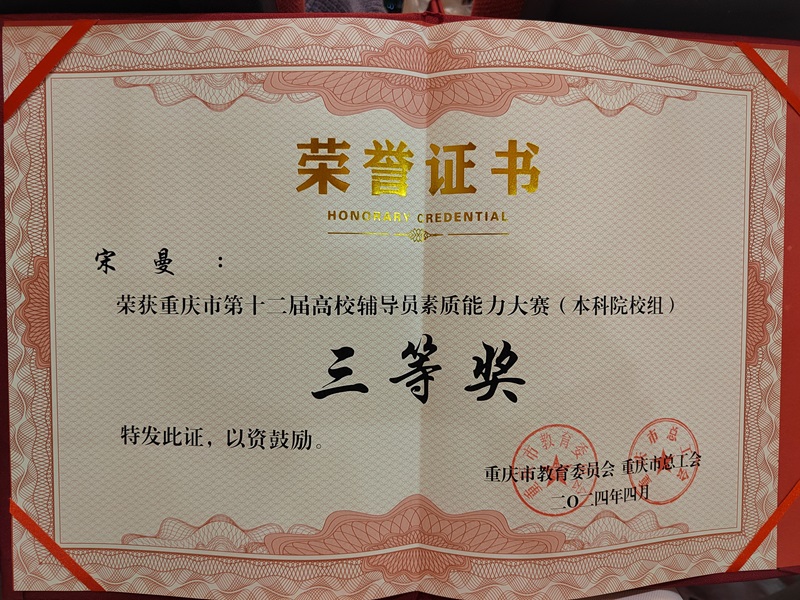 本网讯(文/图 管理学院 王燕楠)4月3日,重庆市第十二届辅导员素质能力大赛圆满落幕,我校管理学院辅导员宋曼凭借出色的专业素养和扎实的业务能力,在激烈的竞争中脱颖而出,荣获大赛三等奖的优异成绩。