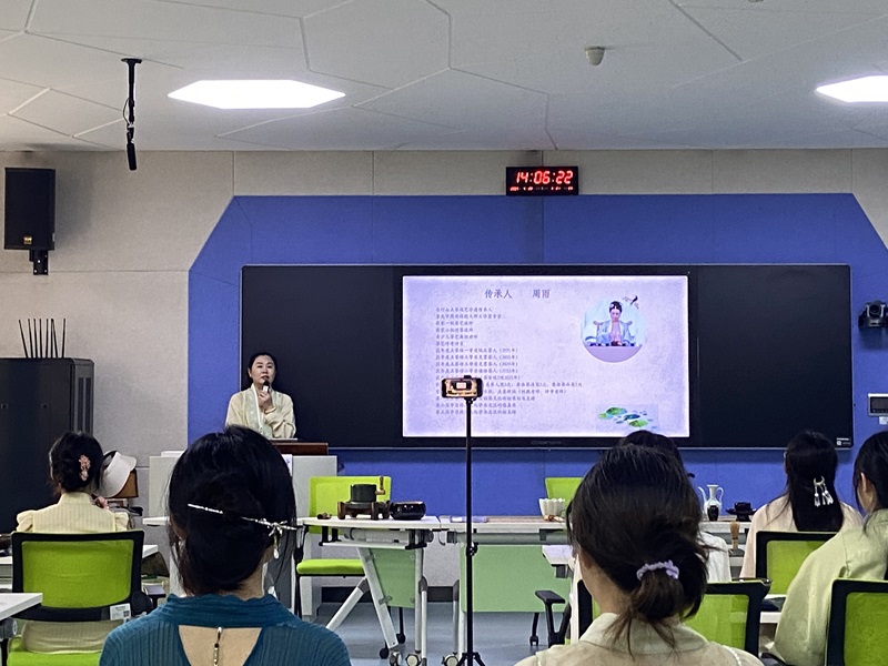 茶文化作为中华优秀传统文化的重要组成部分,具有深厚的历史底蕴和广泛的群众基础。本次活动邀请重庆唯一的宋代点茶技艺非遗传承人——周雨,为我校师生带来一场极具古典气息和文化底蕴的点茶技艺宣讲及体验活动。周雨从热播的电视剧《梦华录》“点茶”“斗茶”技艺引入,详细介绍了点茶技艺的诞生、发展到兴盛的演变流程;由蔡襄的《茶录》到宋徽宗赵佶的《大观茶论》,展现出宋代文人雅士高超的点茶、斗茶与品茶技艺。