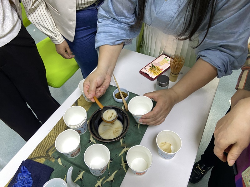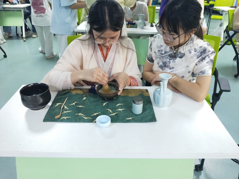 随后,周雨老师与助手分别从“碾茶、注汤、击拂、分茶”四个环节,现场展示了《大观茶论》中最著名的七汤点茶法,完整地呈现了点茶技艺的全过程,还展示了令现场师生赞叹的宋代“茶百戏”。在场师生在周雨老师及助手的指导下,也亲身体验了点茶技艺,并表现出了极高的热情。其中,两位同学的表现优异,得到了周雨及在场师生的一致赞同,并获得了周雨茶室的邀请参加后续非遗文化传承活动的机会。