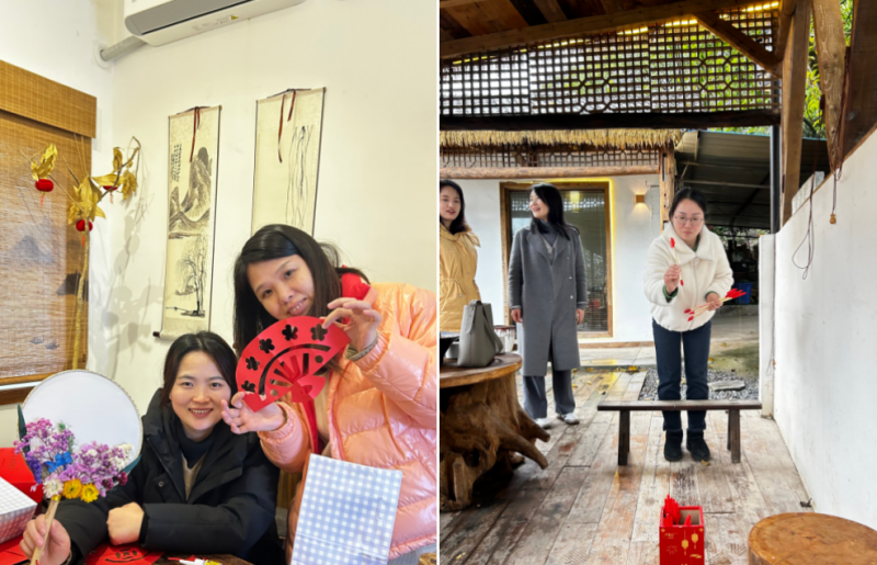 本次活动在风景如画的南山——放肆南山设计师的院子举行。这里环境优雅,氛围宁静,为活动的开展提供了得天独厚的条件。在活动中,女教师们积极参与了干花团扇制作、剪窗花等传统手工艺活动,以及富有挑战性的投壶游戏。这些活动不仅弘扬了中华传统文化,还锻炼了老师们的动手能力和创造力,有效缓解了工作压力,进一步增进了同事间的友谊。