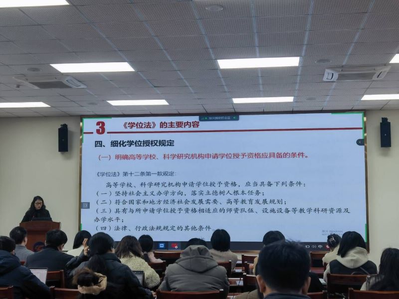 最后,根据会议议程安排,陈艳莲组织开展了《中华人民共和国学位法》解读。与会人员共同深入学习了《学位法》的立法背景,明晰其顺应教育发展趋势、规范学位管理的重要意义;梳理了该法的基本框架,涵盖学位授予单位、学位授予程序等关键板块;细致研习了《学位法》的主要内容,进一步提升了对学位相关法律法规的认知水平,为学校学位管理工作依法依规开展筑牢理论基础。