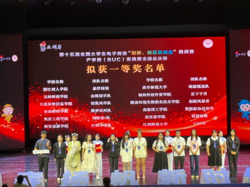 本网讯(文/图 新媒体电商学院 陈子阳)7月21日,第十五届全国大学生电子商务“创新、创意及创业”挑战赛产学用(BUC)实战赛全国总决赛在江西应用科技学院举行,我校新媒体电商学院参赛团队斩获佳绩。比赛中,由新媒体电商学院教师王维冰带领的网联商e队,历经激烈角逐,凭借扎实的项目质量与出色的现场表现,在100多支队伍中脱颖而出,最终斩获一等奖,为学校再添荣誉。