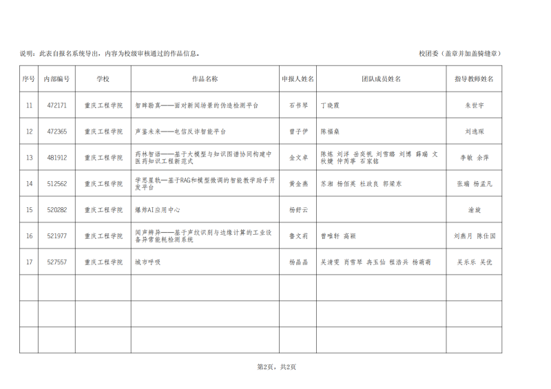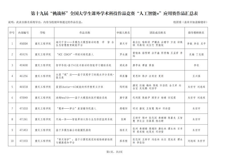 按照《关于组织开展第十九届“挑战杯”全国大学生课外学术科技作品竞赛重庆市选拔赛的通知》(渝青发〔2025〕12号)要求,我校于6月下旬至7月上旬期间顺利开展了第十九届“挑战杯”全国大学生课外学术科技作品竞赛“人工智能+”应用赛作品选拔工作,经校级综合评审,最终推选出《海问千言——多模态大模型驱动的教・学・督全生态智慧教育赋能平台》等作品17个,现就作品推报结果公示如下,推报名单详见附件。