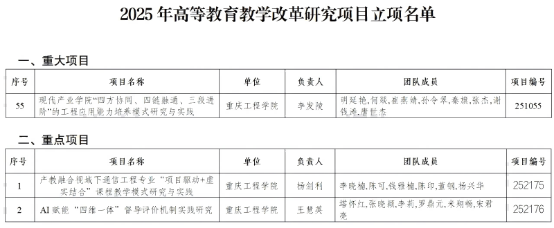 重庆市教委发布《关于公布2025年高等教育(本科)教学改革研究项目评选结果的通知》(渝教高函〔2025〕48号),学校获批立项8个项目,包括重大项目1项,重点项目2项,一般项目4项,教育教学数字化转型专项项目1项。