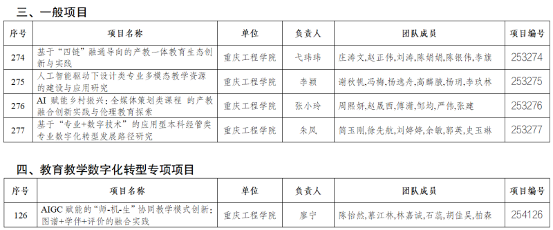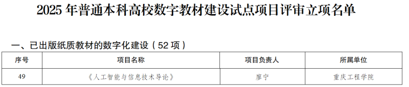 重庆市教委发布的《关于公布2025年普通本科高校数字教材建设试点项目立项名单的通知》(渝教高函〔2025〕50号),我校廖宁副教授牵头申报的《人工智能与信息技术导论》项目,成功获批"高水平课程数字教材建设试点项目"立项。
