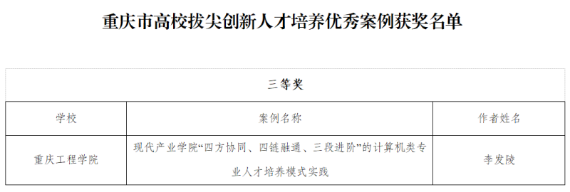 我校计算机与物联网学院院长李发陵教授组织申报的《现代产业学院“四方协同、四链融通、三段进阶”的计算机类专业人才培养模式实践》,荣获重庆市高校拔尖创新人才培养优秀案例三等奖。