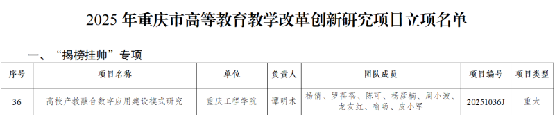 重庆市教委发布了《关于公布 2025 年重庆市高等教育教学改革创新专项研究项目立项名单的通知》(渝教高函〔2025〕46 号),我校副校长谭明术教授主持的《高校产教融合数字应用建设模式研究》获批为“揭榜挂帅”重大项目。