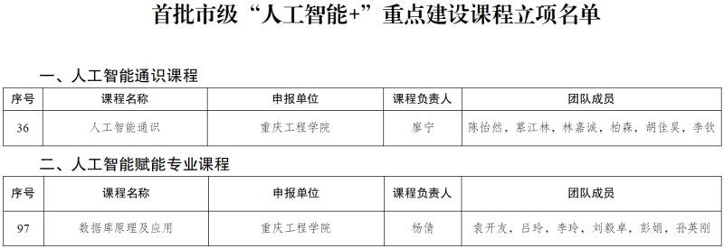 重庆市教委发布的《关于公布首批市级“人工智能+”重点建设课程立项名单的通知》(渝教高函〔2025〕34号),我校2门课程获批立项,其中廖宁副教授负责的《人工智能通识》课程立项为市级人工智能通识课程,杨倩教授负责的《数据库原理及应用》课程立项为市级人工智能赋能专业课程。