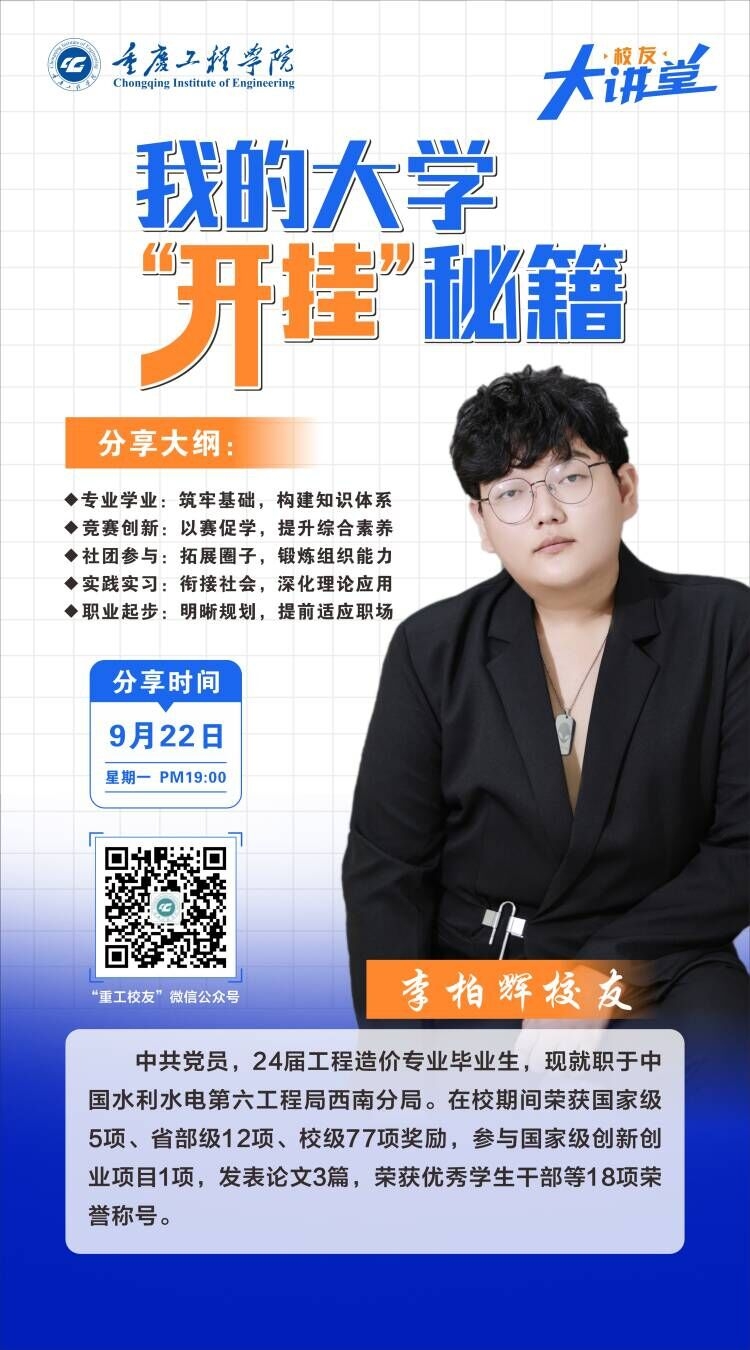 本网讯(文/图 就业指导中心 叶秋清)9月22日晚,学校就业指导中心通过鹅直播线上平台举办“校友大讲堂”活动,邀请2024届工程造价专业校友李柏辉作题为“我的大学开挂秘籍”的专题分享,全校共计2900余人次在线参与。