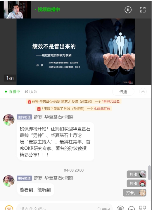 为拓宽干部与储备干部教育教学视野和理念,提升工作的“获得感”,实现组织、团队和个人目标“联动共赢”,人事处(教师发展中心)借助在线直播于4月8日再次组织处级干部、职能部门全体员工、二级学院科级干部、行政人员参加了中国劳动关系学院人力资源管理研究所所长、副教授、首席人力资源专家-孙波博士“绩效不是管出来的”系列讲座的第二讲。