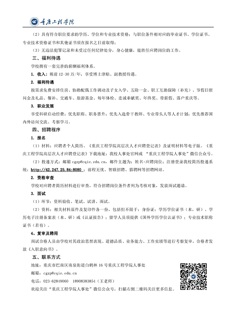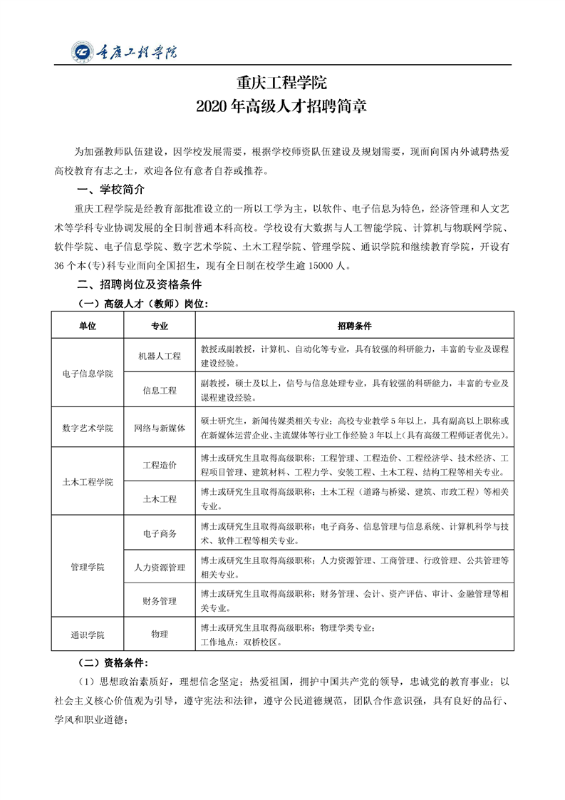 重庆工程学院2020年高级人才招聘简章