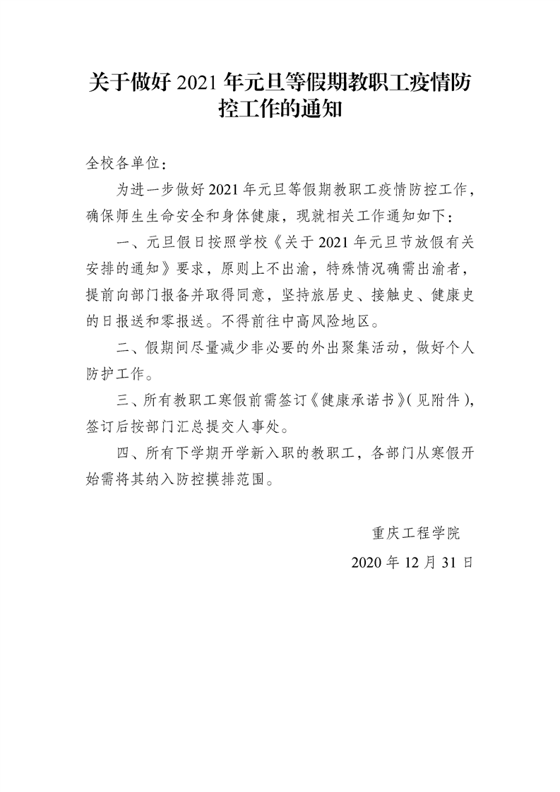 关于做好2021年元旦等假期教职工疫情防控工作的通知