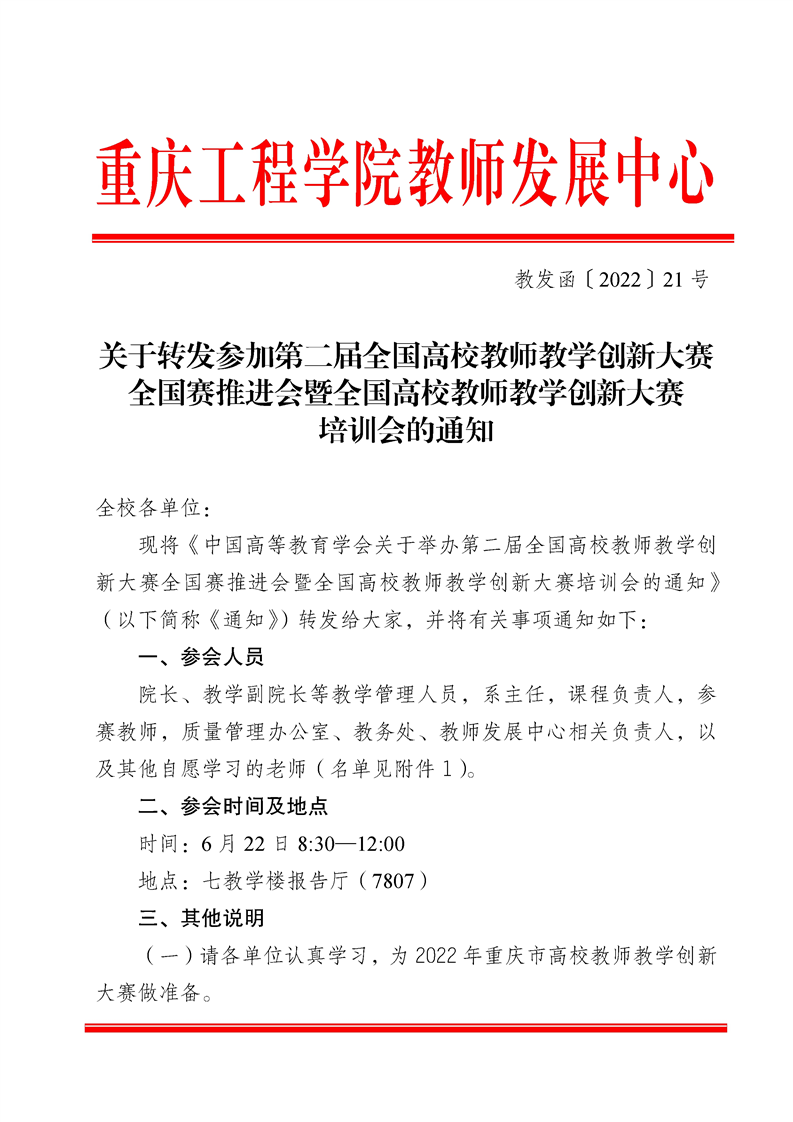 关于转发参加第二届全国高校教师教学创新大赛全国赛推进会暨全国高校教师教学创新大赛培训会的通知
