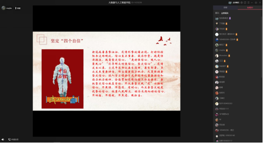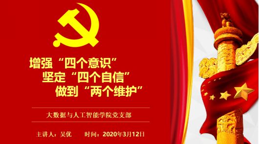 2020年3月12日晚,大数据与人工智能学院党支部书记吴优为全院师生党员、发展对象、入党积极分子上了一堂别开生面的线上党课!吴书记以在线平台授课的方式深刻地讲述了党员在抗击疫情的形势下,如何增强四个意识,坚定四个自信,做到两个维护。