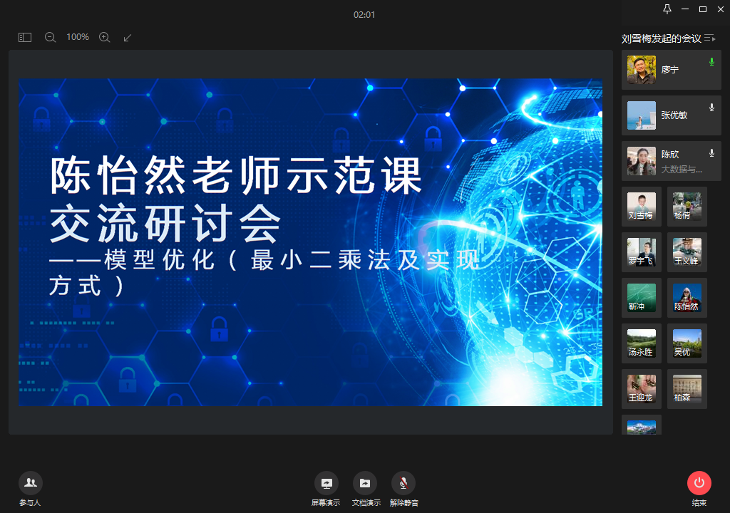 会上,首先陈怡然老师介绍4月7日周二上午1-2节“模型优化(最小二乘法及实现方式)”示范课的设计思路与具体实施方案:本次课分为“课前”、“课上”、“课后”三部分。课前发布精讲视频,采用问卷形式调查学生预习情况与出勤情况。课上“精讲”、“细讲”与“提炼总结”相结合,引导为主,及时组织学生讨论与分享,关注学生的反馈情况,了解学生掌握状况。课后安排回顾与练习,巩固本次课所学知识点。