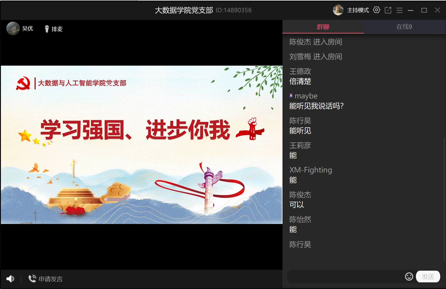 携一缕浅夏的芬芳,凝一脂冰清玉洁的清梦,五月特有的浓郁连同崭新的学习计划悄悄来临。大数据与人工智能学院党支部根据市教委对学校的要求,为提高对“学习强国”平台的利用,于2020年4月30日晚19:00全体师生党员相约QQ群课堂,围绕“学习强国、进步你我”的活动主题进行深刻地交流,并率先启动大数据学院党支部“学习强国”学习计划。