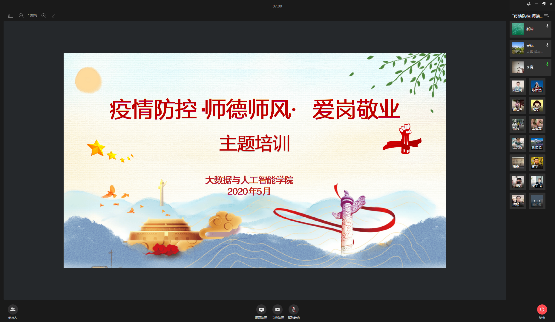 为了进一步做好疫情防控工作,全面落实“五严五防”举措,切实保障每位教职工与学生、家人、同事的身心健康及生命安全,及时有效阻断疫情传播途径,根据学校疫情防控工作领导小组的部署,大数据与人工智能学院于2020年5月13日13:30通过企业微信组织召开“疫情防控.师德师风.爱岗敬业”的专题培训,副书记吴优主持,全院教师参会。
