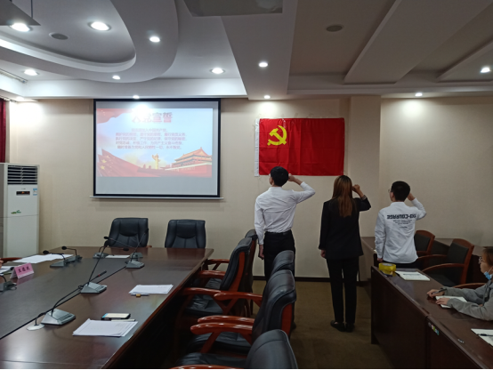 答辩会最后,陈星材同志面对党旗进行庄严宣誓。希望所有党员同志无论身处何处,敢于实践,传播正能量,充分发挥党员先锋模范作用,时刻严格要求自己,向优秀党员看齐。