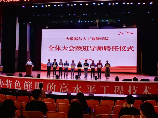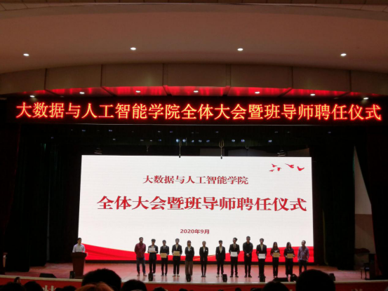 本网讯(文/唐蕾 图/大数据与人工智能学院学生会)为加强学院管理工作,做好同学们的学业过渡及专业教育,充分发挥优秀任课教师和管理人员的作用,进一步推进学院人才培养工作和教育教学工作的衔接,9月16日下午,学院在学术报告厅举行全院大会暨班导师聘任仪式。学院院长曹耀钦、党支部副书记尚伟、副院长陈欣、各年级班导师、辅导员及学院全体学生共同出席。大会由学院党支部副书记尚伟主持。