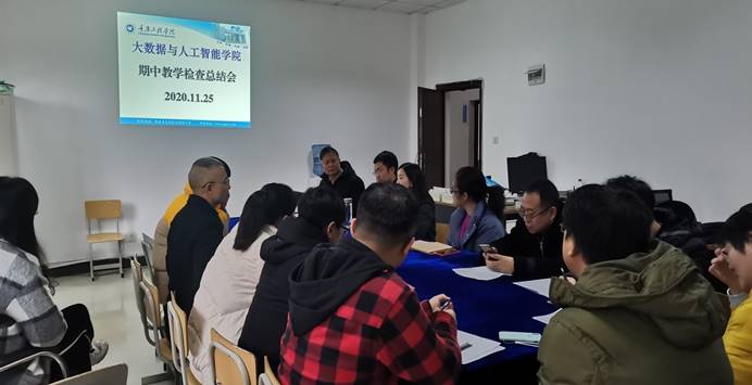 本网讯(图/文 刘雪梅)为了切实抓好教学常规管理,加强对任课教师教学环节的监督与检查,认真总结成绩,及时发现和改进教学中的不足,于2020年11月25日15:00大数据与人工智能学院在老办公楼102组织召开2020-2021学年第1学期期中教学检查总结会,院长曹耀钦主持,全院专任教师参与。