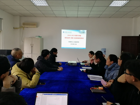 本网讯(图/文 李华龙)为帮助教师熟悉业务流程,避免教学事故频发,增强教师处理应急事件能力,规范教师监考行为及资料归档规范,大数据与人工智能学院于12月23日14:00在老办公楼102组织开展了2020-2021学年第1学期期未监考、阅卷及装档规范培训,会议由曹耀钦院长主持,大数据与人工智能学院全体教师参会。