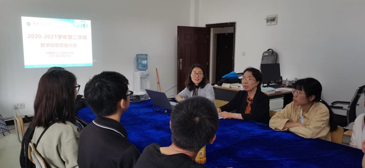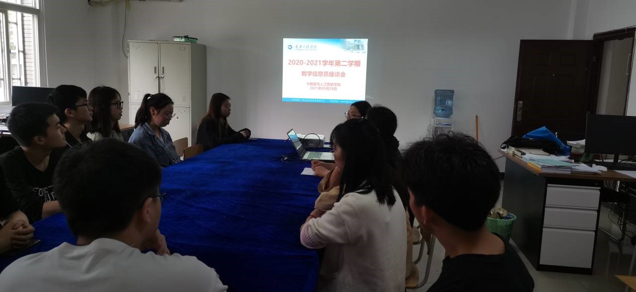 本网讯(文/李华龙 图/许琳)为进一步完善教学质量保障体系,解决本学期学生课堂内外的问题,跟进解决措施施行进度,了解学生反馈情况,大数据与人工智能学院于5月28日13:00在办公室102组织开展了教学信息员座谈会,会议由副院长陈欣主持,学校督导郭爱平教授出席,各班级学委及代表参会。