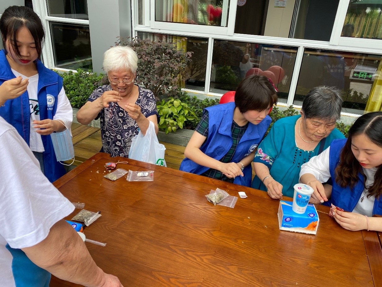 志愿者与老人们一起玩游戏、聊家常、分工合作做香包,将制作好的香包亲手送给老人,并送上自己真诚的祝福,希望在以后的每一个端午节老人们都能过得开心。